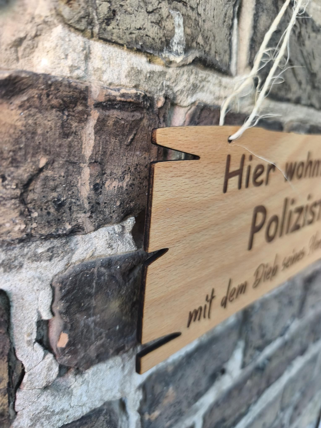 Dieses liebevoll gestaltete Holzschild mit der Gravur „Hier wohnt ein Polizist mit dem Dieb seines Herzens“ sorgt garantiert für ein Schmunzeln an jeder Haustür.