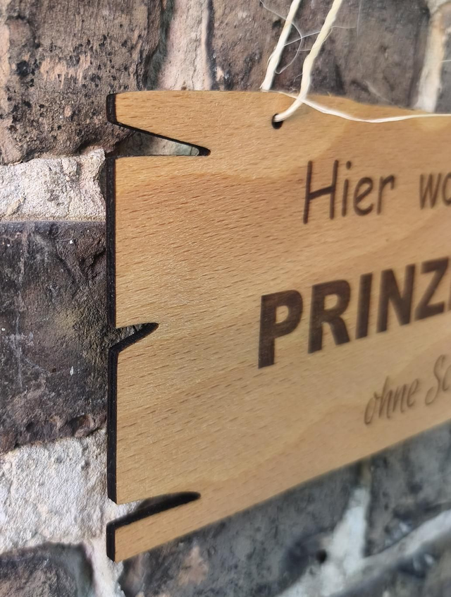 Mit der Gravur „Hier wohnt eine Prinzessin ohne Schloss“ ist dieses Schild ein echter Hingucker an der Tür, Wand oder im Flur. Ideal für humorvolle Deko oder als originelles Geschenk.