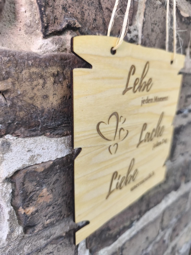 Holzschild „Lebe jeden Moment, Lache jeden Tag, Liebe unermesslich“ – Dekoschild mit Lebensmotto